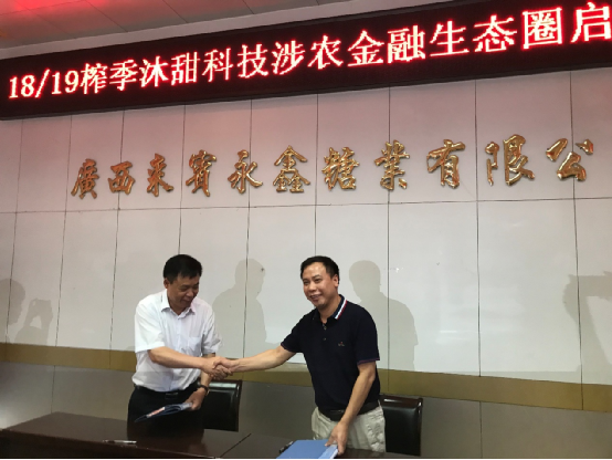 沐甜柳州20日讯 为有效整合蔗糖资源,推动广西糖业“二次创业”助力食糖行业发展,实现优势互补,合作共赢。9月20日上午,“18/19榨季沐甜科技涉农金融生态圈启动仪式”在来宾永鑫糖业圆满举行,沐甜科技股份有限公司和广西湘桂糖业集团有限公司、广西永鑫华糖集团有限公司成功签署涉农金融战略合作协议。沐甜科技股份有限公司CFO兼副总裁徐大松、广西湘桂糖业集团有限公司副董事长、广西永鑫华糖集团有限公司监事会主席陈辉、广西永鑫华糖集团有限公司总裁助理冯流洪,中国建设银行、光大银行、中信银行、柳州银行、桂林银行、浦发银行、来宾农合行领导等近30人出席签约仪式。
