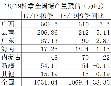 沐甜2日讯 18/19榨季全国食糖产销工作会议11月1日在海口召开,在下午的会议上,各主产区发布了18/19榨季的糖产量预估。整理如下: