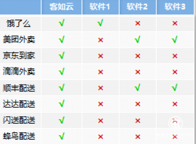 如今,客如云已经成为了市面上最为优秀的外卖管理系统,在外卖平台和配送行业的对接上,客如云占据数量和质量上的绝对优势。客如云已全面对接打通了饿了么(已合并百度外卖)、美团外卖、滴滴外卖、京东外卖这四大外卖平台。在配送业务上,有些店觉得平台配送价格不合适,自己配送又没有时间,客如云为商家对接了顺丰、达达、闪送、蜂鸟等配送企业,可以让商家自由选择,避免被外卖平台“绑架”。