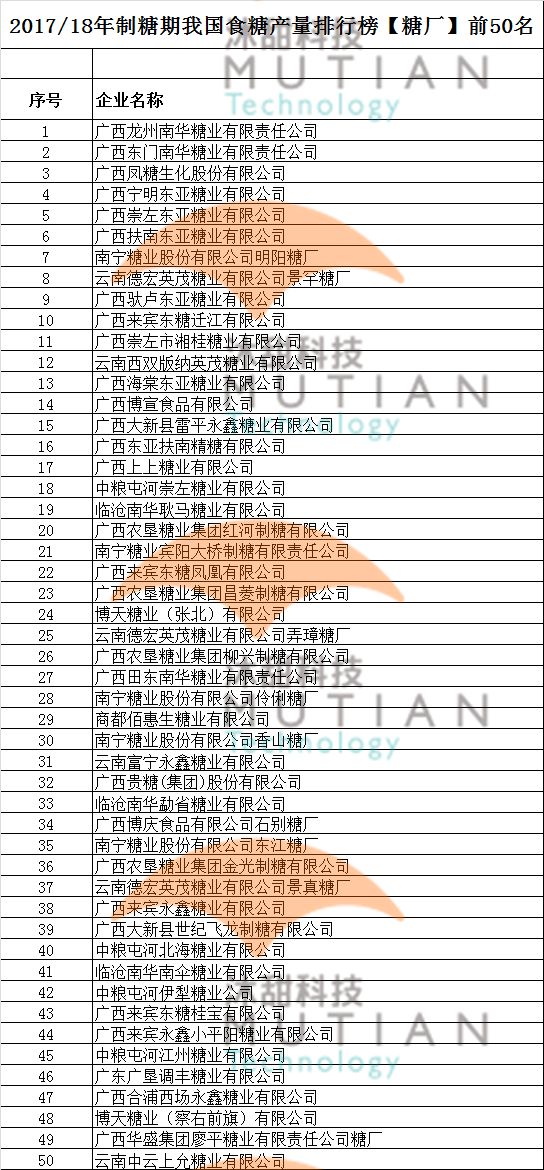 沐甜20日讯 最新一期的《中国糖业》杂志上,刊登了2017/18年制糖期我国食糖产量排行榜【糖厂】前50名,现予以公布如下: