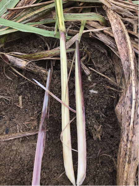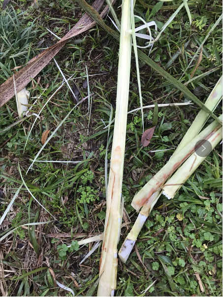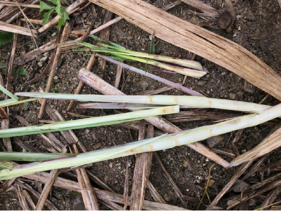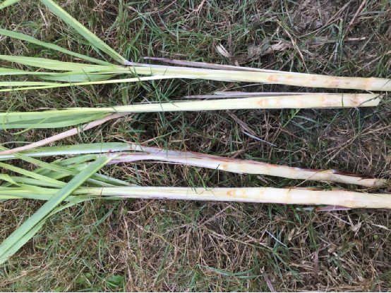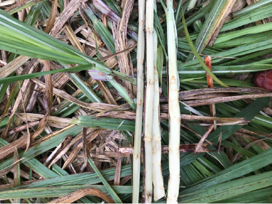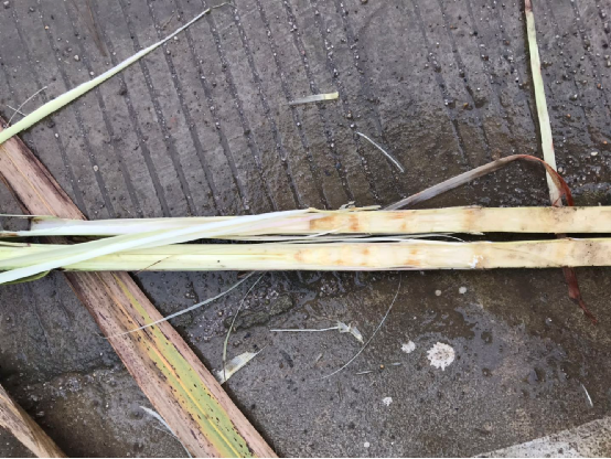 宜州市刘三姐镇蔗区的甘蔗,叶子青绿色为主,剥开甘蔗,生长点和心叶稍微变色,但是并不严重,地上的蔗苗里面生长点和心叶受灾变色,但是总体上并不算严重。
