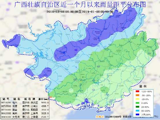 广西近一个与以来雨量距平分布图