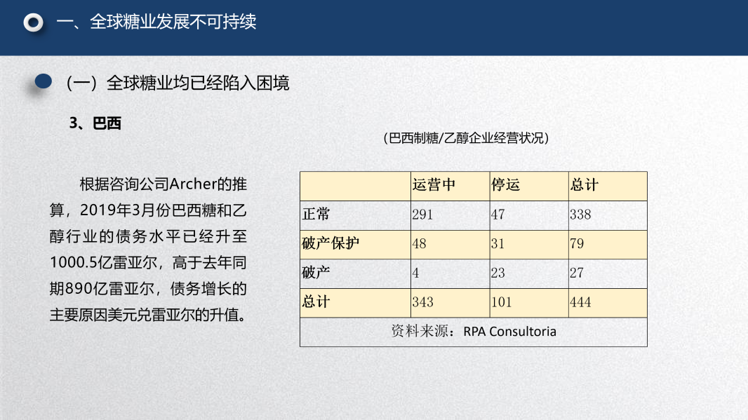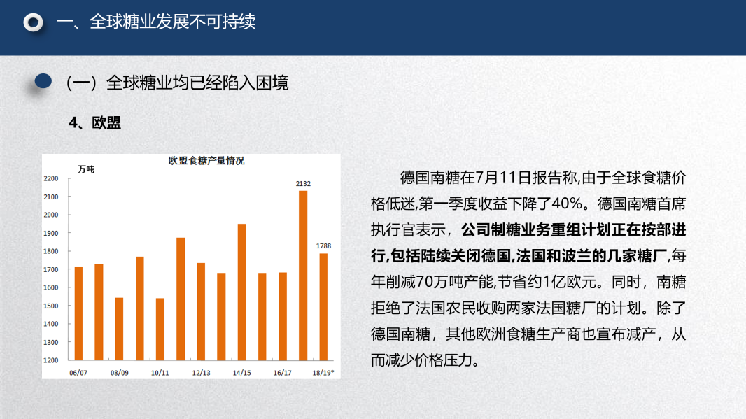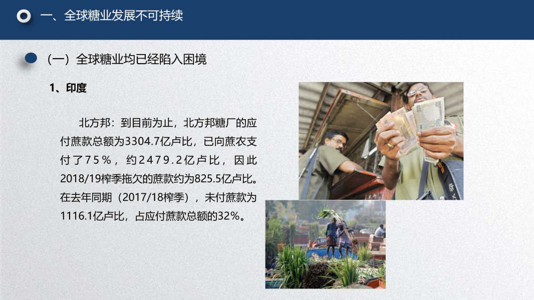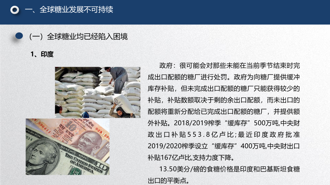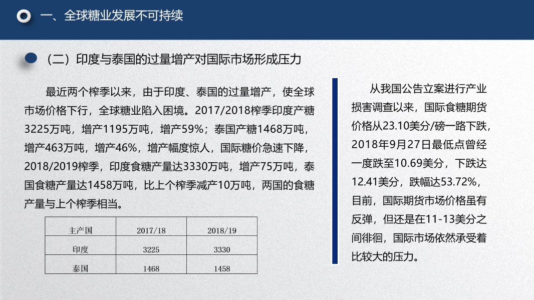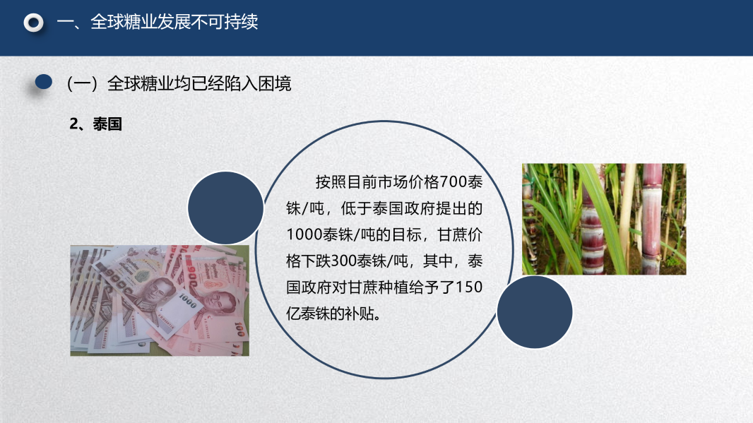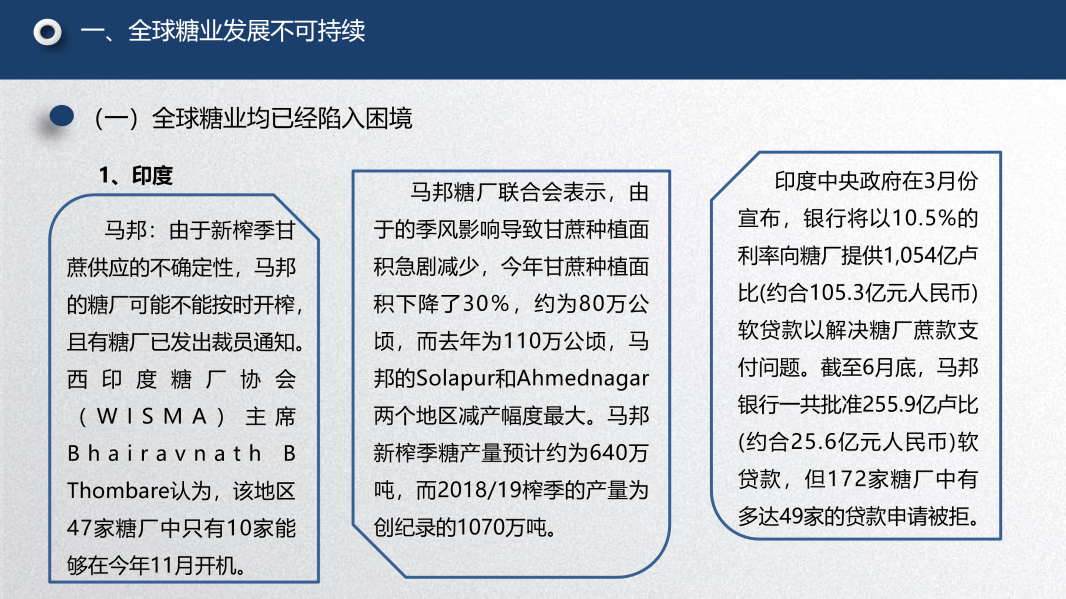 第一个问题是糖业全球化下除了中国之外的其他主要产糖国的一些情况。我的观点是:全球糖业按照目前的这种状况,它的发展是不可持续的。