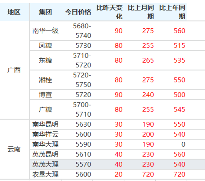 数据上看,国内食糖库存偏紧是不争的事实,一定程度上刺激了看涨方的“激情”再起;今日广西及云南的集团当日上调20-90元,两地的贸易商也不甘示弱纷纷上调了现货价格,涨幅在40-70元。据了解,广西南华上调2次报价,成交变现不俗;云南今日南华、英茂都进行了3次调价格,销量近万,贸易商由于糖价上涨,库存有限,惜售心理加重,以至于销量偏淡一些。
