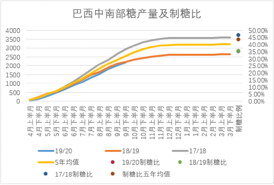 巴西中南部4-9月底累计产糖2180万吨,同比减少2.1%,较近5个榨季均值减少14.6%。本榨季制糖比亦有望跌破上榨季创下的新低。由于本榨季压榨期天气比上榨季干燥,压榨进度较快,预计糖厂收榨早于上榨季。本榨季的最终糖产量预计在2500-2600万吨之间。