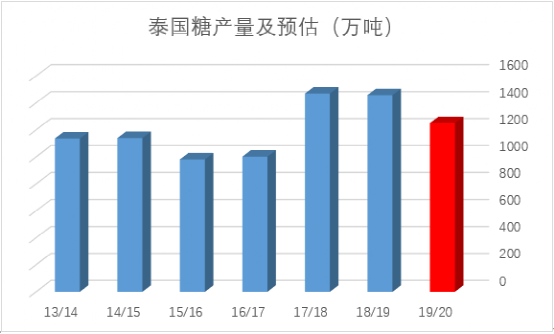 泰国糖厂通常在11月底至12月初开榨,18/19榨季11月20日开榨,与往年相比较早。关注本榨季的开榨时间。预计19/20榨季开榨糖厂57家,与上榨季持平,预计甘蔗压榨量1.19亿吨,低于上榨季的1.31亿吨,主要因干旱影响种植面积。预计糖产量在1200-1300万吨之间,产量下滑主要因甘蔗价格下跌触发蔗农改种其他作物。