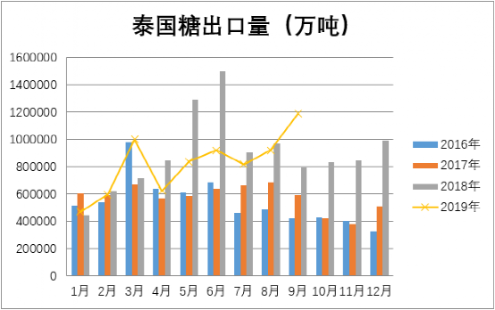 在持续了几个月的低迷之后,9月份泰国糖出口重新爆发,共计出口糖约119.01万吨,同比大增49.72%。其中出口原糖64.38万吨,同比增加30.44%;出口低质量白糖约6.66万吨,同比增加42%;出口精制糖47.97万吨,同比大增88.51%,精制糖主要出口至菲律宾(14.3万吨)、苏丹(9.92万吨)、柬埔寨(3.19万吨)和中国(3.08万吨)。2018/19榨季泰国共计出口糖1005.84万吨,同比增加6.95%,为史上最高榨季出口水平。