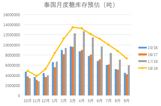 在9月大量出口的提振下,泰国糖库存下降略有加速之势,但连续两个榨季的高产仍然导致19/20榨季期初库存创新高。截至9月底库存量约为731.8万吨,同比增加21.7%。因泰铢汇率上涨及全球糖价低迷,泰国预计19/20榨季将在糖出口及生产中共计亏损100亿泰铢。