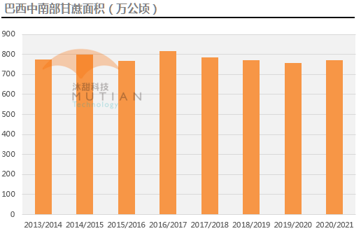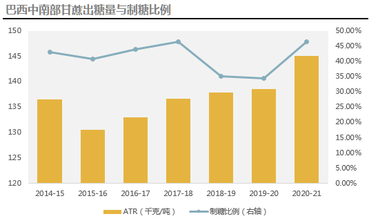 由于预计2月下旬到3月份新开榨糖厂少于去年同期,本榨季中南部最终糖产量预计约为3830万吨,同比大增43%。20/21榨季巴西中南部食糖生产主要呈现三个特点:一、长时间的干燥天气使得收割面积同比增加2.06%,至约770万公顷,但相对16/17榨季的高峰仍处于减退阶段;甘蔗压榨量预计同比增加约3%至6.1亿吨;二、出糖率创历史新高(吨甘蔗出糖量约为145千克);三、制糖比例创最近三年最高水平(预计最终制糖比约为46.3%)。
