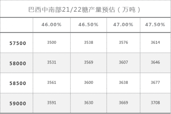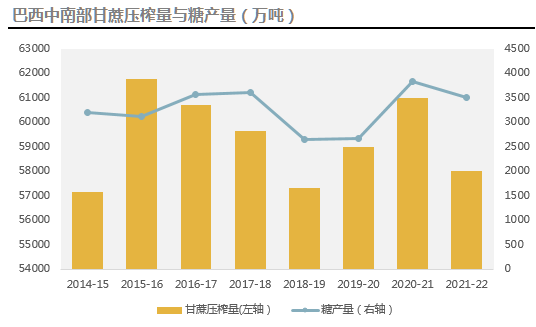 预计去年较为干旱的天气可能导致巴西中南部21/22榨季甘蔗供应量、单产和出糖率下降,由于压榨量减少,预计制糖比例相对上调,预计下榨季巴西糖产量降至约3540-3600,关注3月份糖厂的开榨进度。