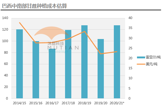 巴西甘蔗种植成本占据食糖/乙醇生产成本的70%以上。据行业抽样调查结果显示,2020/21榨季中南部地区甘蔗平均种植成本从103.56雷亚尔/吨增加至127.37雷亚尔/吨,增幅约23%,主要因收割成本上涨、以美元计价的肥料价格上涨以及雷亚尔汇率大幅贬值等因素导致。从美元计价的成本来看,20/21榨季的种植成本仅同比增加5.2%,至23.37美元/吨。