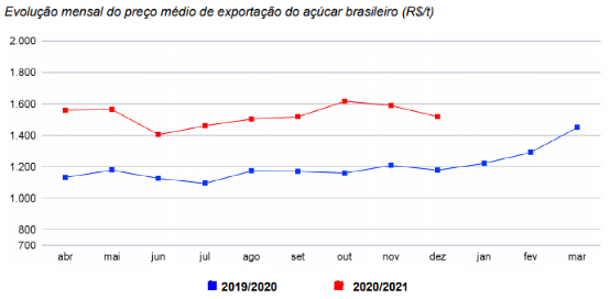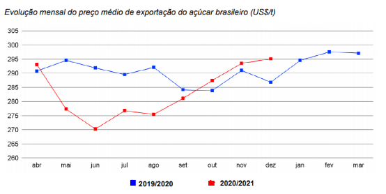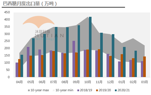 巴西20/21榨季20年4月-21年2月累计出口糖3208.34万吨,同比大增80.41%。主要因产量创下历史新高。20/21榨季(截至12月)巴西的平均出口价约为283.04美元/吨,同比下降3%,但在雷亚尔汇率大跌的背景下,雷亚尔计价的出口收益大增27%,达到1525.15雷亚尔/吨。