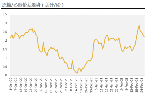 巴西中南部2月上旬已有1家糖厂重新开榨,近期巴西乙醇价格受到原油及巴西国内油价上涨的带动达到历史新高,折合原糖价格超过15美分/磅,而原糖在3月合约交割后开始回调,原糖/乙醇价差迅速收缩。但由于最近巴西总统因油价不断上调而更换巴西国有石油公司C EO,意味着政府开始出手干预燃油价格上涨,后期或有更多干预政策出台,恐导致巴西油价与国际原油价格的关联性减弱,加上巴西疫情未结束,后期燃油消费的不确定性仍然很大,预计后期乙醇的上涨空间有限,下榨季糖厂增加用于生产乙醇的甘蔗量的可能性不大。