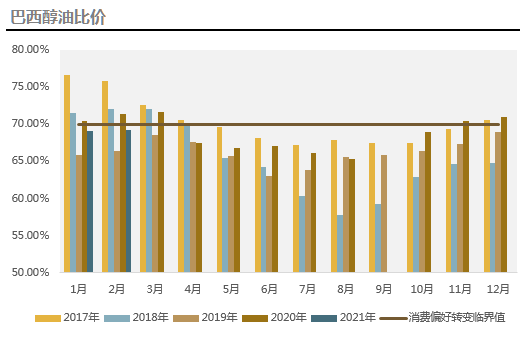 受到产量减少的影响,去年10月开始巴西醇油比价开始接近70%的临界值,乙醇价格竞争力减弱,或导致乙醇消费量受到抑制。