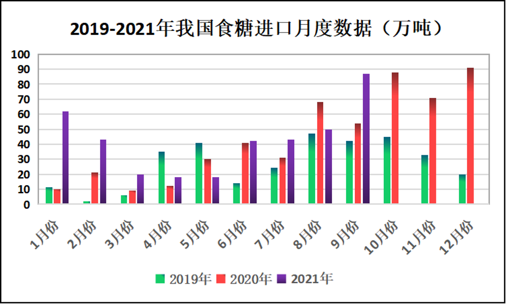2019-2021年我国食糖进口月度数据