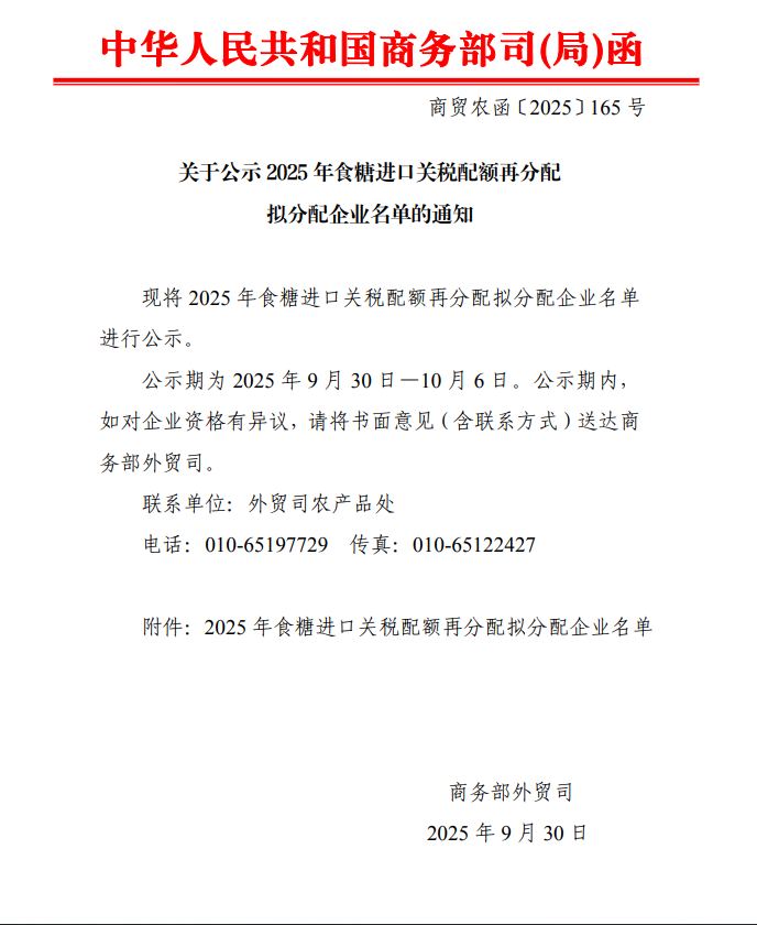 关于公示2025年食糖进口关税配额再分配拟分配企业名单的通知