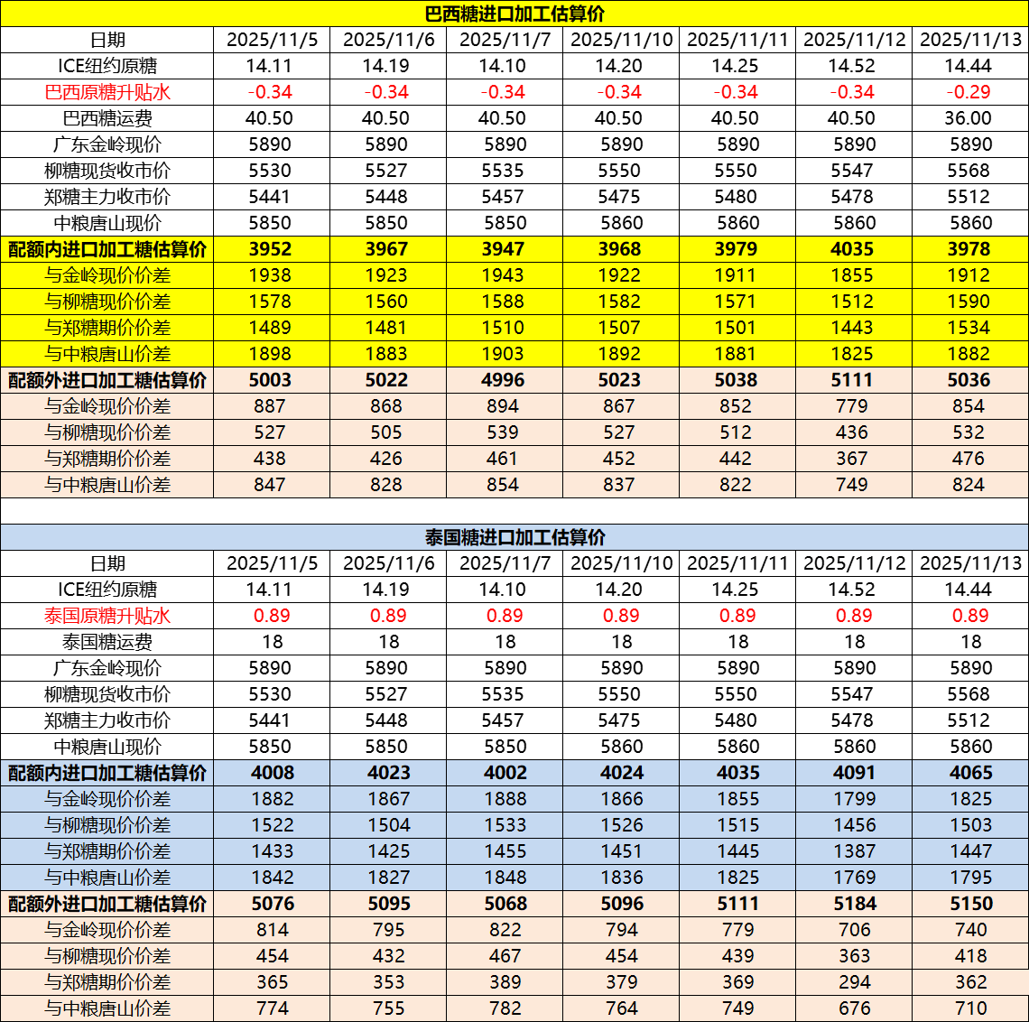 巴西泰国进口糖升贴水、运费及加工成本(11月14日更新)