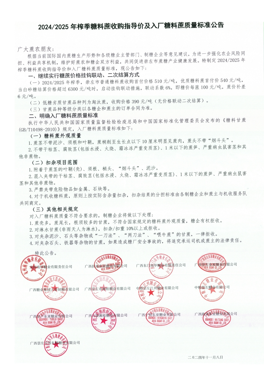 根据当前国际国内蔗糖生产形势和各级糖业主管部门、制糖企业等意见建议,为进一步强化农企风险同担、利益共享机制,维护好蔗农和糖企双方利益,共同促进崇左市蔗糖产业健康发展。特制定 2024/2025 年榨季糖料蔗收购指导价和入厂糖料蔗质量标准,现公告如下: