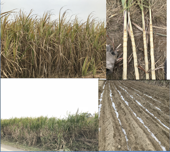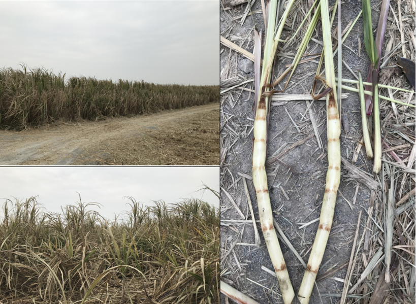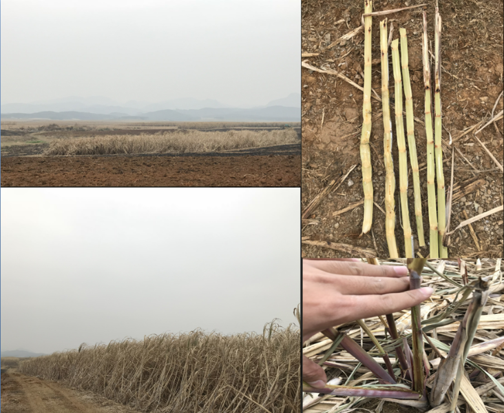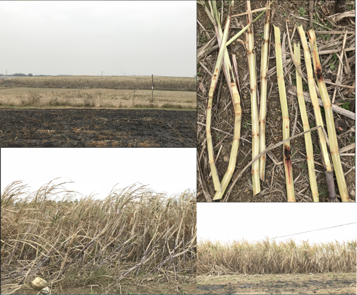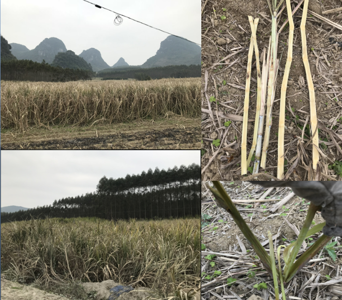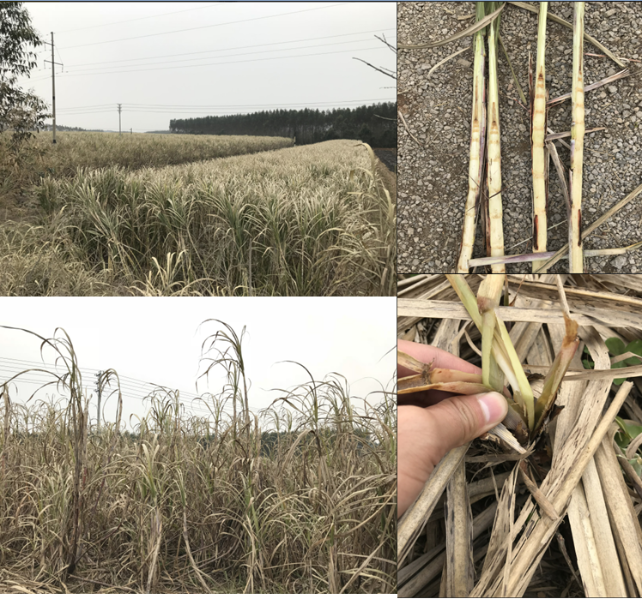 上面四张图是来宾市武宣镇蔗区受冻的甘蔗,这和12月份一片青绿的蔗地形成了鲜明对比,笔者发现蔗叶也已经全部枯白,全茎受冻,属于重度受灾,甘蔗平均锤度只有19.13%。