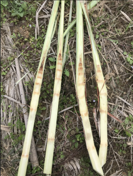 上面两张也是大湾镇蔗区的受灾甘蔗,只有三分之一左右的叶片受灾,生长点以下3-4节呈水煮状,生长点和侧芽以及心叶受灾变黑,下部分的蔗径没事,甘蔗平均锤度还有22%,属于较高的水平,属于二级受灾。