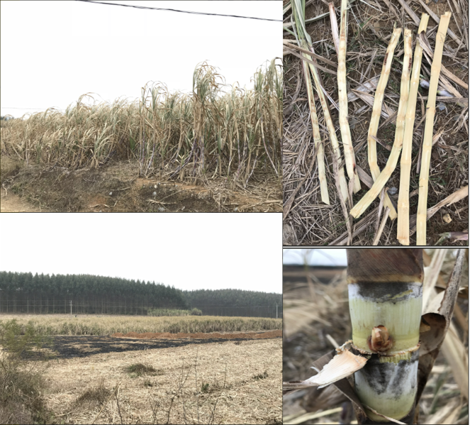 这是属于来宾凤凰镇蔗区的甘蔗受灾情况,大部分甘蔗叶已经枯白,侧芽已死,心叶和生长点受灾变黑,蔗径呈水煮状,有很明显的酒味,甘蔗平均锤度只有18.6%,甘蔗锤度已经受到严重影响,影响了甘蔗糖分,属于重度受灾。